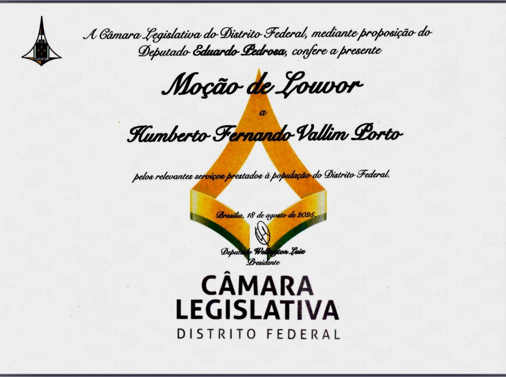 O Dr. Humberto Fernando Vallim Porto, sócio fundador do Vallim Advogados, recebeu da Câmara Legislativa do Distrito Federal, por proposição do Deputado Eduardo Pedrosa, a Moção de Louvor em reconhecimento aos relevantes serviços prestados à população do Distrito Federal.